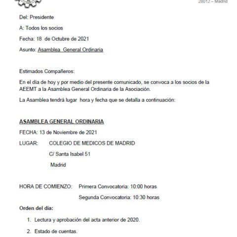 Convocatoria Asamblea General Ordinaria de la AEEMT 2021
