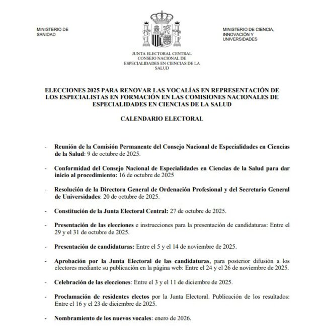 Elecciones de residentes 2025 en Medicina del Trabajo El Ministerio de Sanidad y el Ministerio de Ciencia, Innovación y Universidades han convocado oficialmente las elecciones de vocales residentes que formarán parte de las Comisiones Nacionales de las [...]